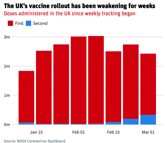早前,英国疫苗的分发速度已经放缓了数周。在2月初的两周内,英国达到了每周300万剂首发的速度,此后每周分别为240万、250万和210万剂:持续下降超过20%。而本周的分发量仅有200万剂。