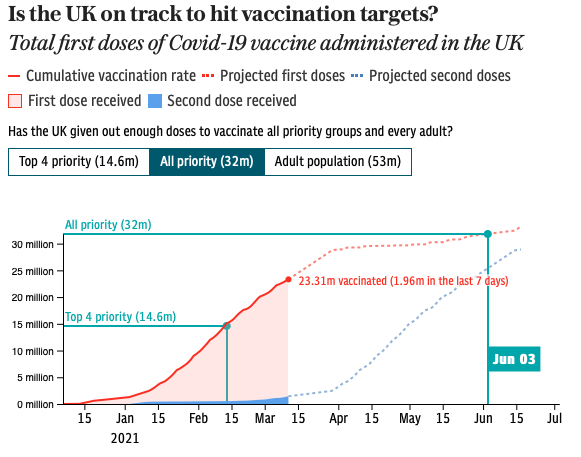 早前首相鲍里斯(Boris Johnson)承诺,将在4月15日之前向所有50岁以上的人提供注射,并在7月底之前向所有18岁以上的人提供注射。