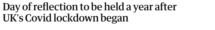 英国将设立“国家哀悼日”(National Day of Reflection),以纪念英国首次进入封锁状态一周年,并为在新冠病毒疫情期间死亡的超过125,000人进行哀悼。