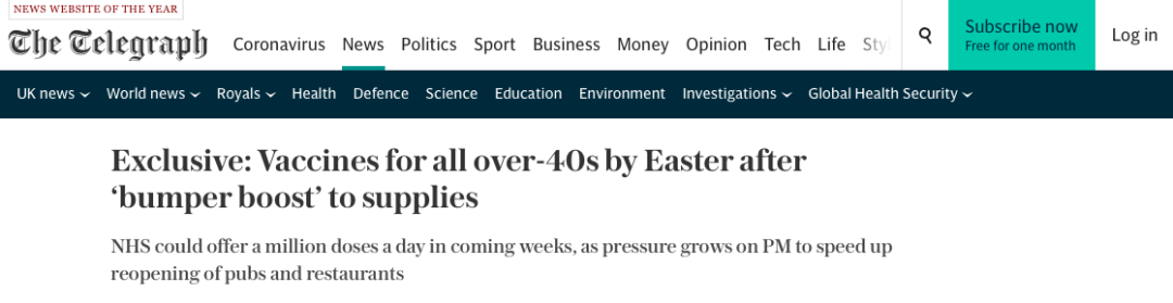 《电讯报》(TheTelegraph)透露,从下周开始,疫苗接种计划将“大规模扩张”,每个40岁以上的人可能可以在复活节前接种他们的第一剂新冠疫苗。