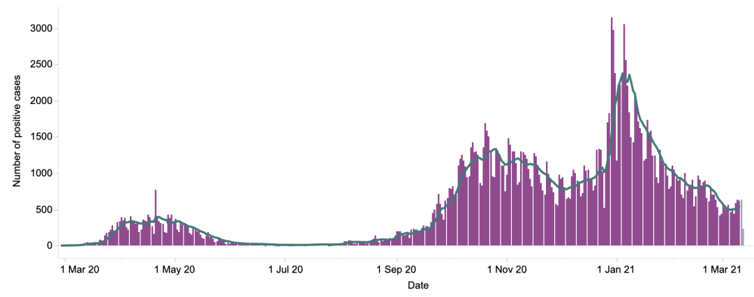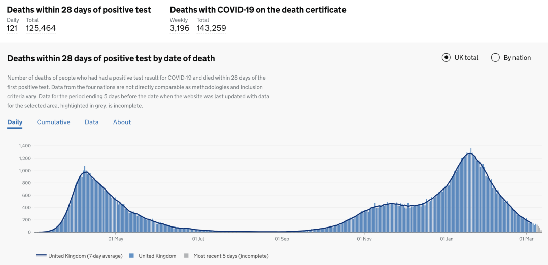 截止至2021年3月13日(周六)英国时间09:00,累计检测结果量99,753,919次(待更新);累计确诊4,253,820例(+5,534);累计病亡125,464例(+121)。
