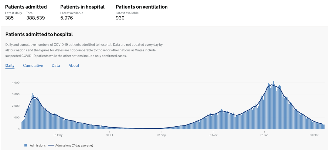 英国全境截至今日,已接种第1剂疫苗共24,839,906人(+386,685);已接种第2剂疫苗共1,663,646人(+53,366)。