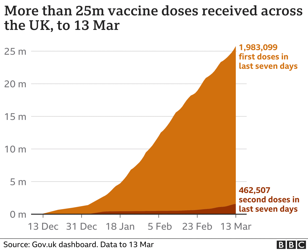 到目前为止,英国已经有超过近2,500万人接种了第一剂新冠疫苗。