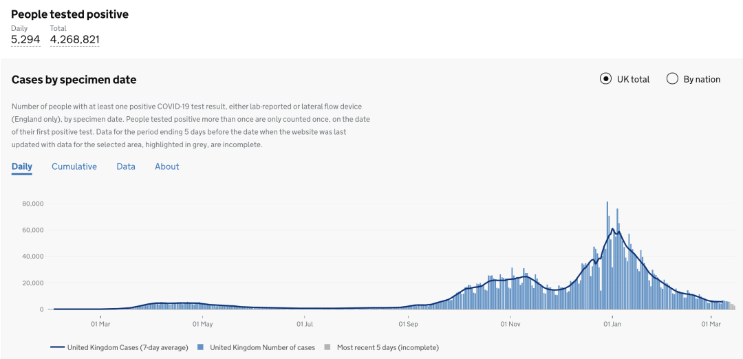 截止至2021年3月16日(周二)英国时间09:00,累计检测结果量104,422,879次(+1,573,774);累计确诊4,268,821例(+5,294);累计病亡125,690例(+110)。