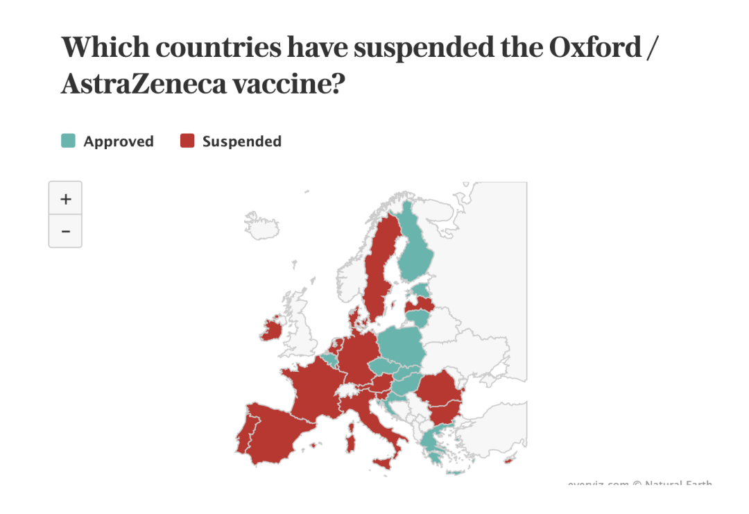 目前暂停使用牛津/AstraZeneca疫苗的欧洲国家已增至16个——丹麦、挪威、保加利亚、冰岛、法国、德国、意大利、西班牙、葡萄牙、斯洛文尼亚和塞浦路斯;另外5个国家:奥地利、爱沙尼亚、拉脱维亚、立陶宛和卢森堡已暂停使用单批次100万剂量的疫苗。