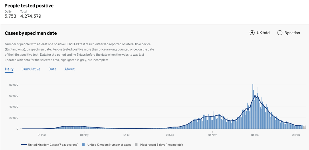 截止至2021年3月17日(周三)英国时间09:00,累计检测结果量104,422,879次(+1,573,774);累计确诊4,274,579例(+5,758);累计病亡125,831例(+141)。