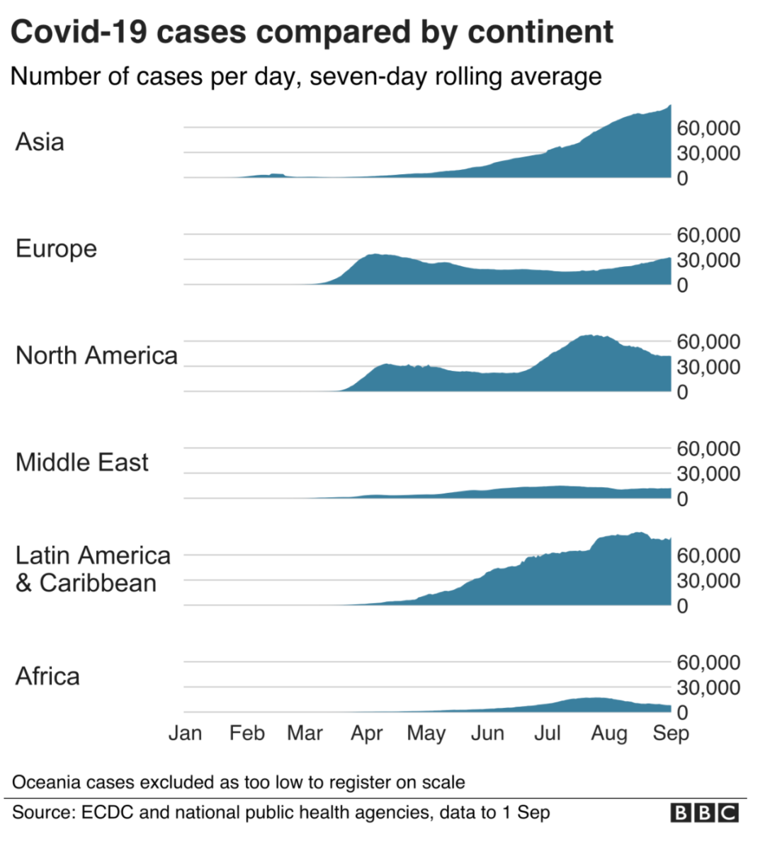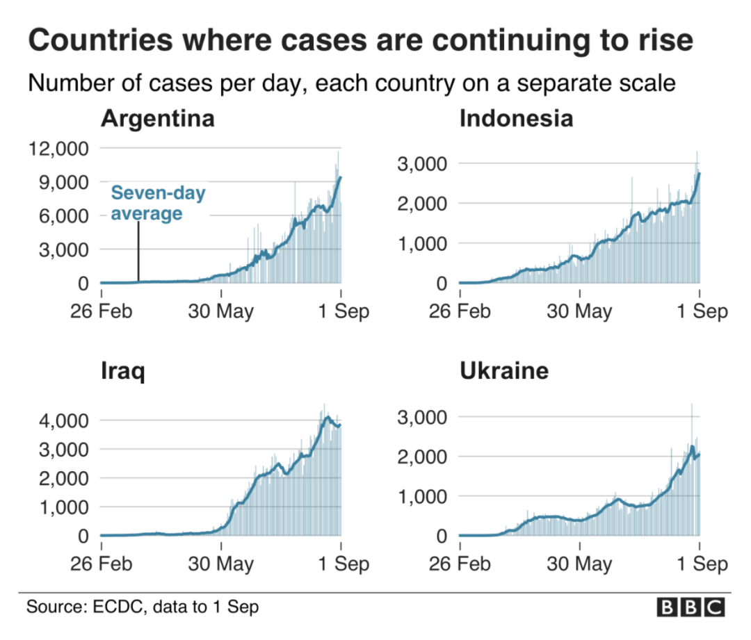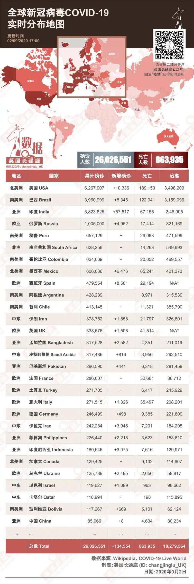 世界的累计确诊人数截止9月2日17:00超过2,602万例(+290k),死亡超过86.3万例(+7k)。
