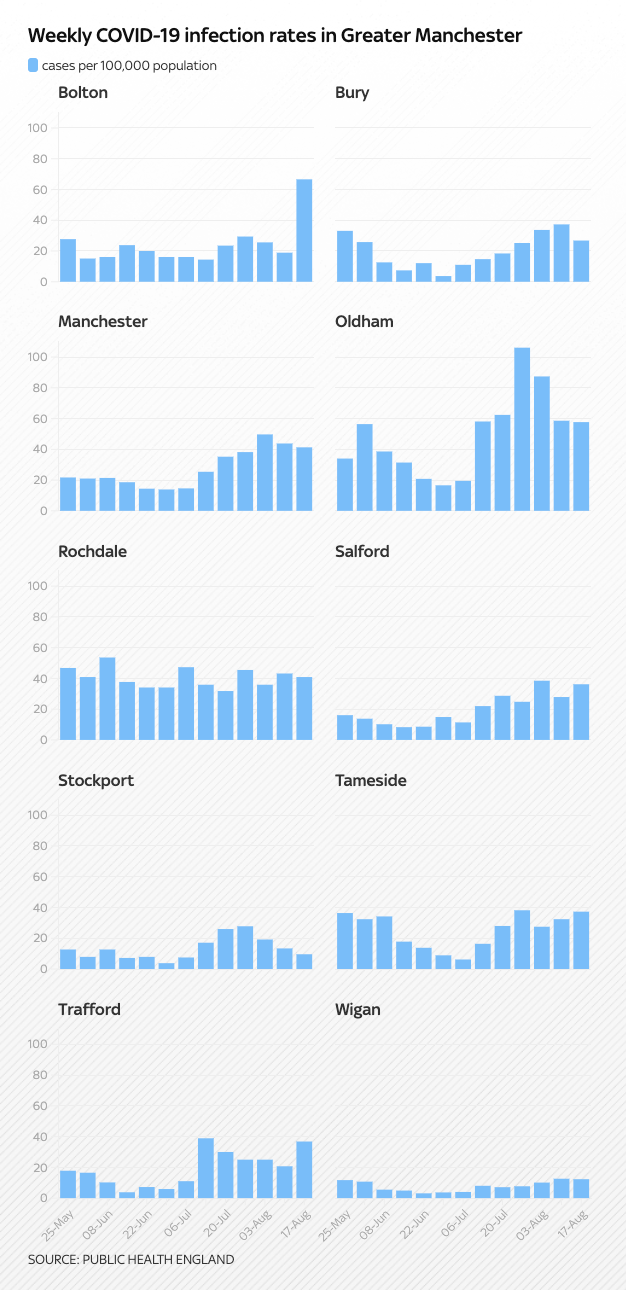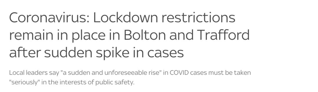 目前官方将会继续观察这两地的疫情数据,将会使用与先前成功控制住疫情地区Oldham、Rochdale以及Stockport的方法来对Bolton以及Trafford进行管控。