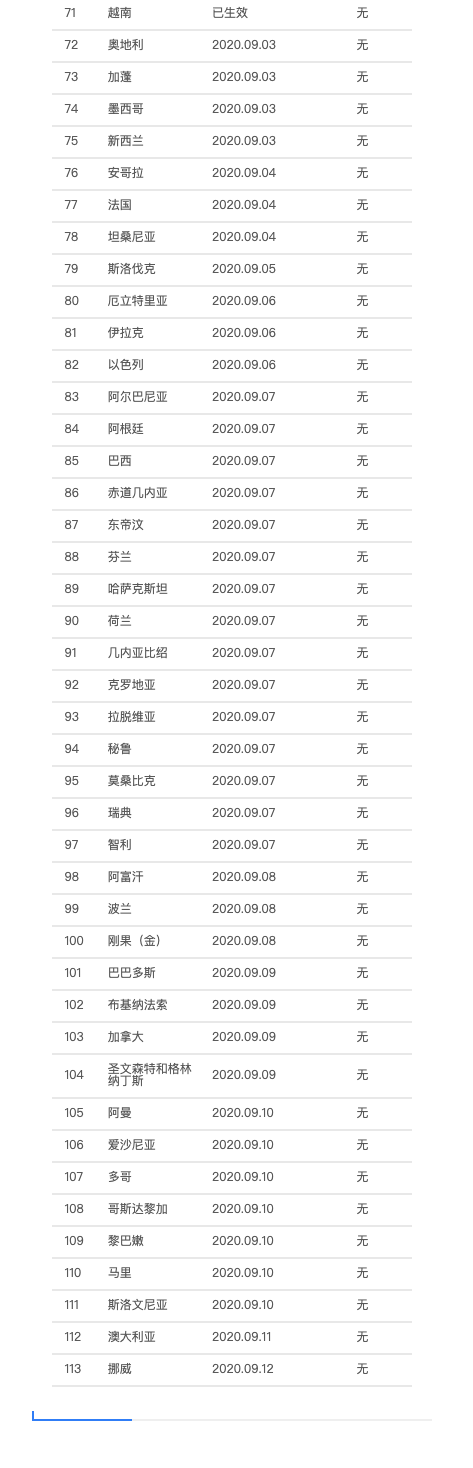 截至9月2日(周三)英国时间17:00,自英国出发直飞/转机前往国内,或从其他地区出发,经停以下113个已实施凭新冠病毒核酸检测阴性证明登机的国家,需