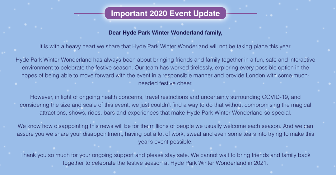 Winter Wonderland表示:由于疫情缘故以及社交距离限制,官方别无选择,只能叫停,并希望能够在2021年11月回归。