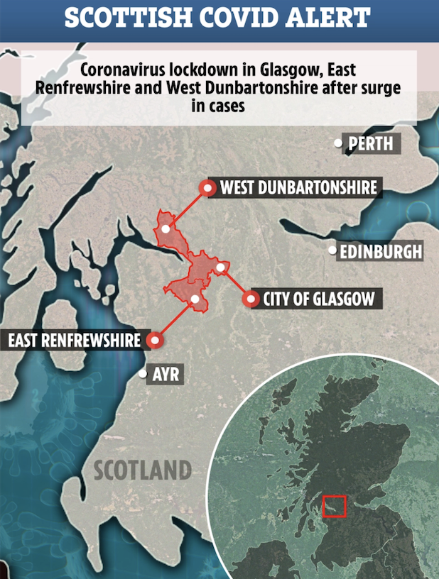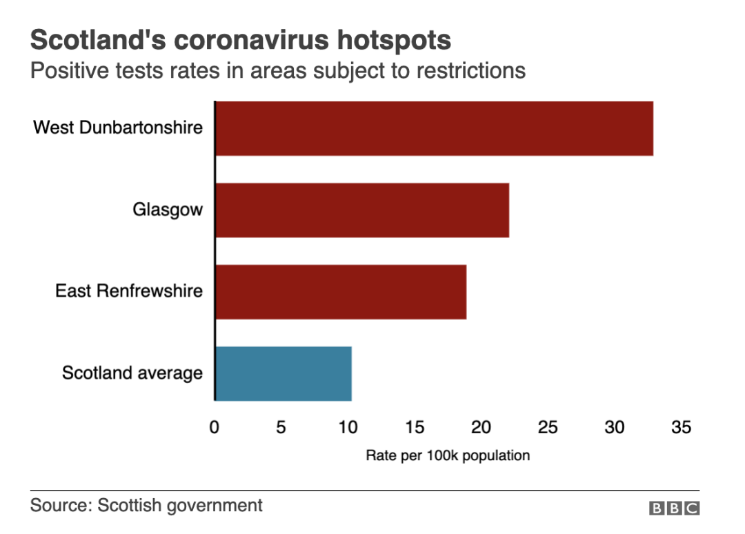 目前,苏格兰每10万人的平均感染率约为10例,但在一些疫情爆发的地区已超过20例/10万人——West Dunbartonshire地区甚至达到了每10万人33例确诊。
