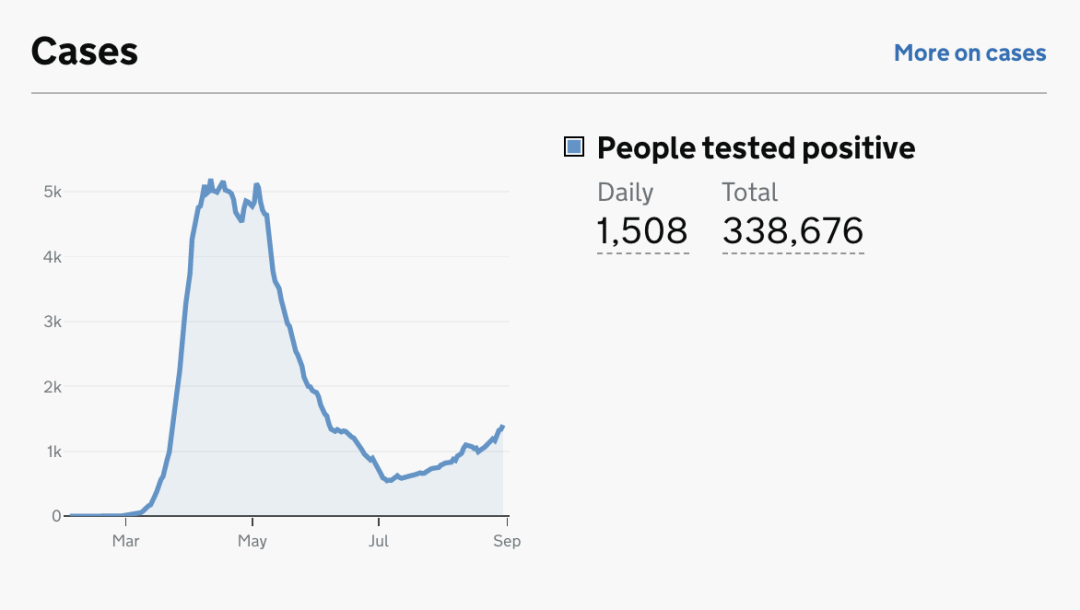 截止至2020年9月2日(周三)英国时间09:00,累计检测结果量16,273,209次(+待更新);累计确诊338,676例(+1,508);累计病亡41,514例(+10);