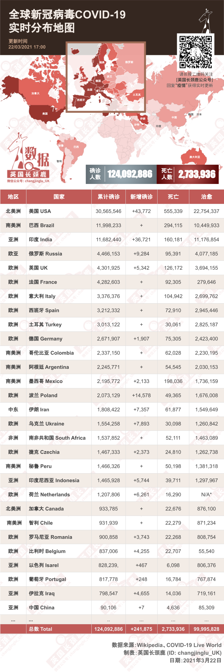 世界的累计确诊人数截止3月22日17:00超过12,409万例(+420k),死亡超过273.3万例(+7k)。
