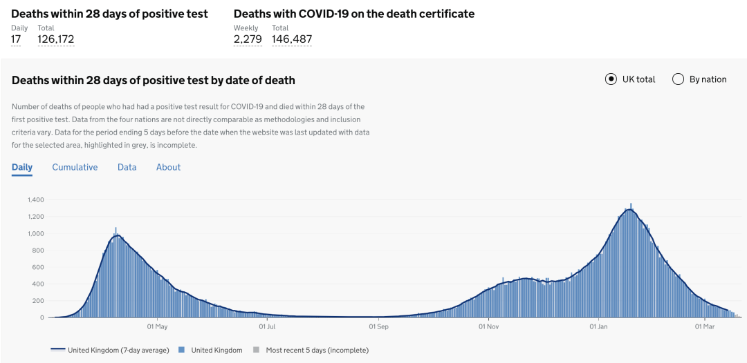 截止至2021年3月22日(周一)英国时间09:00,累计检测结果量112,602,641次(+1,893,830);累计确诊4,301,925例(+5,432);累计病亡126,172例(+17)。