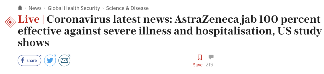 美国一项研究显示,牛津/阿斯利康新冠疫苗对严重或危重病症和住院治疗100%有效。