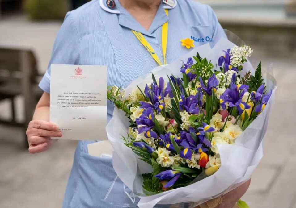 女王在纪念英国首次封锁周年之际,亲手向菲利普亲王做心脏手术的St Bartholomew's Hospital送上鲜花,这捧鸢尾花、郁金香、水仙和小牡丹的大花束,从温莎城堡被带到这里。