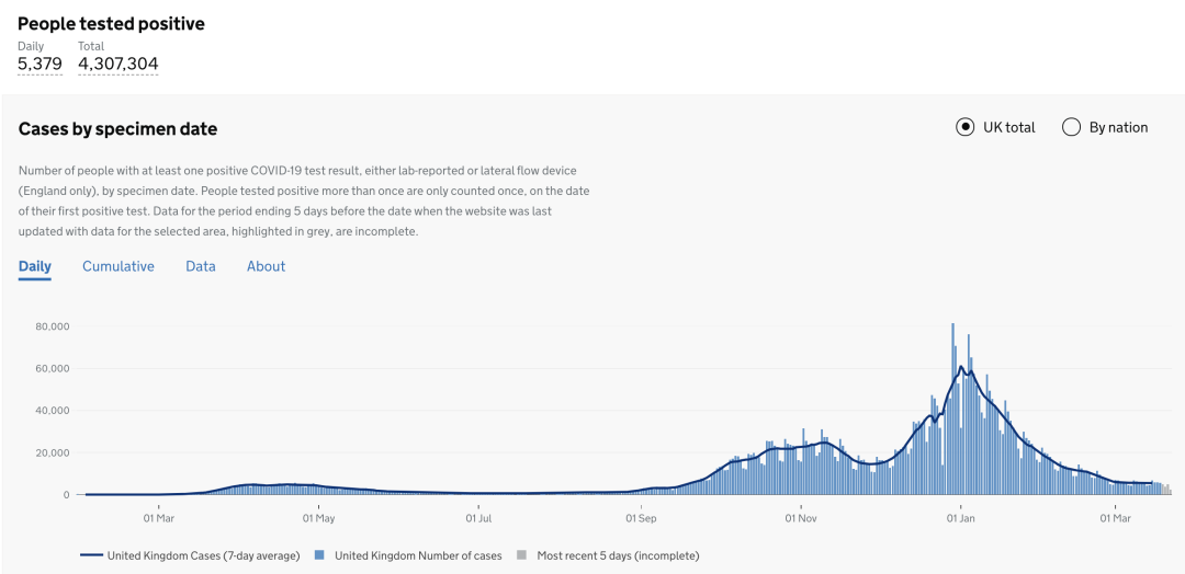 截止至2021年3月23日(周二)英国时间09:00,累计检测结果量113,930,657次(+1,191,048);累计确诊4,307,304例(+5,379);累计病亡126,284例(+112)。