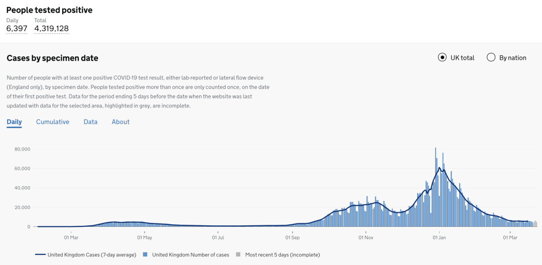 截止至2021年3月25日(周四)英国时间09:00,累计检测结果量116,704,955次(+1,813,842);累计确诊4,319,128例(+6,397);累计病亡126,445例(+63)。