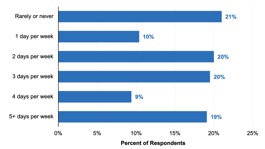 一项新的在线调查显示,接近80%的人希望2022年可以在一周中有时间居家带薪工作,其中2-3天的居家办公时间受到40%人群的支持。