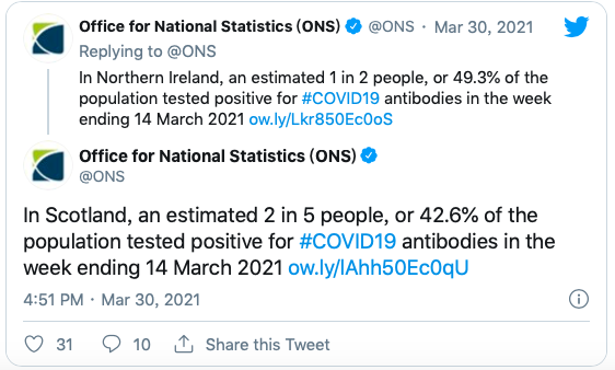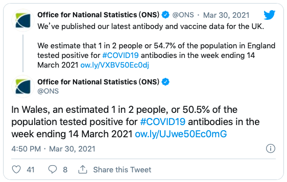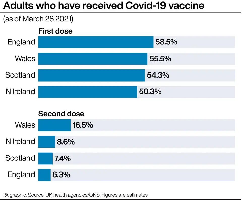根据英国国家统计局(ONS)的最新估计,在截至3月14日的一周内,英格兰约有54.7%私人家庭中的人对新冠抗体呈阳性反应,威尔士和北爱尔兰分别有50.5%和49.3%。
