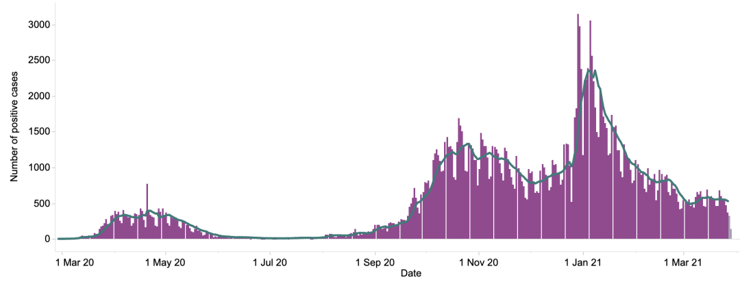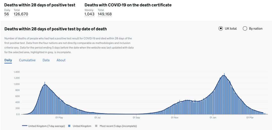截止至2021年3月30日(周二)英国时间09:00,累计检测结果量121,071,863次(+1,641,942);累计确诊4,341,736例(+4,040);累计病亡126,670例(+56)。