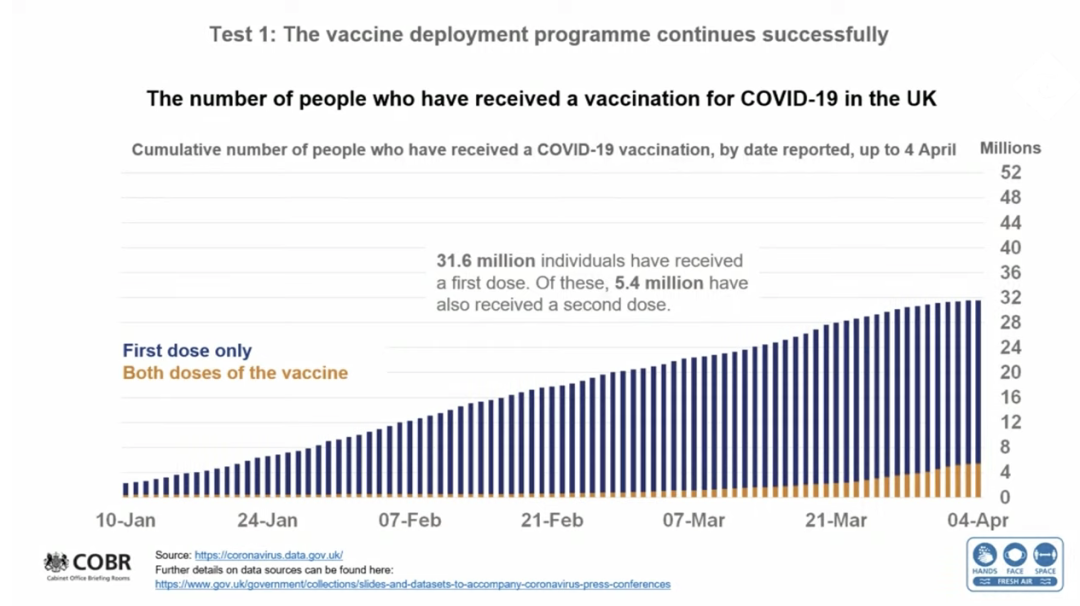英国全境截至今日,已接种第1剂疫苗共31,581,623人(+58,613);已接种第2剂疫苗共5,432,126人(+50,381)。