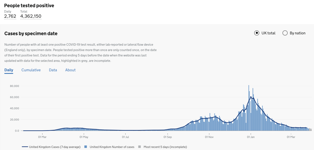 截止至2021年4月5日(周一)英国时间09:00,累计检测结果量124,147,198次(待更新);累计确诊4,362,150例(+2,762);累计病亡126,862例(+26)。