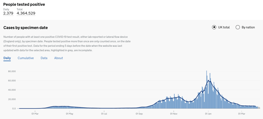 截止至2021年4月6日(周二)英国时间09:00,累计检测结果量124,147,198次(待更新);累计确诊4,364,529例(+2,379);累计病亡126,882例(+20)。