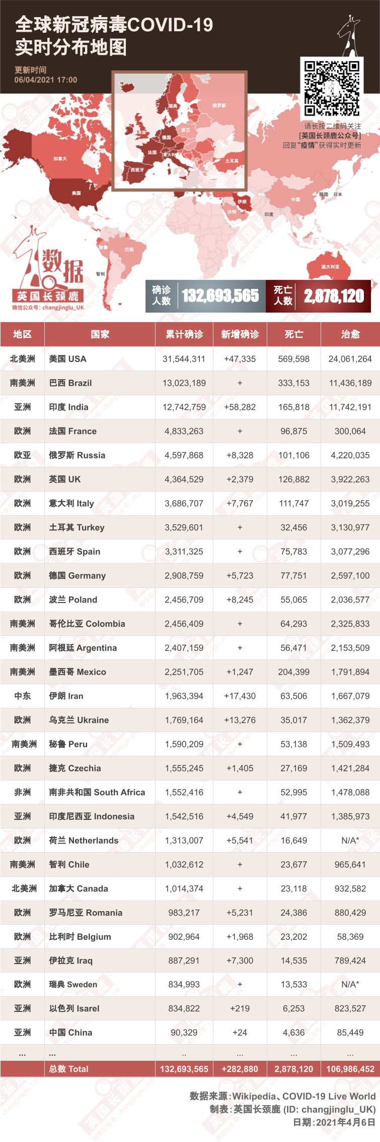 世界的累计确诊人数截止4月6日17:00超过13,269万例(+510k),死亡超过288.7万例(+8k)。