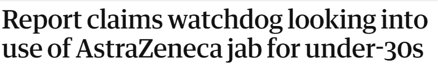 第4频道(Channel 4)新闻周一(4月5日)晚间声称,由于担心罕见血栓严重副作用的发生,药品和保健品监管机构(MHRA)正在考虑限制对30岁以下人们使用牛津-阿斯利康(Oxford - AstraZeneca)疫苗。