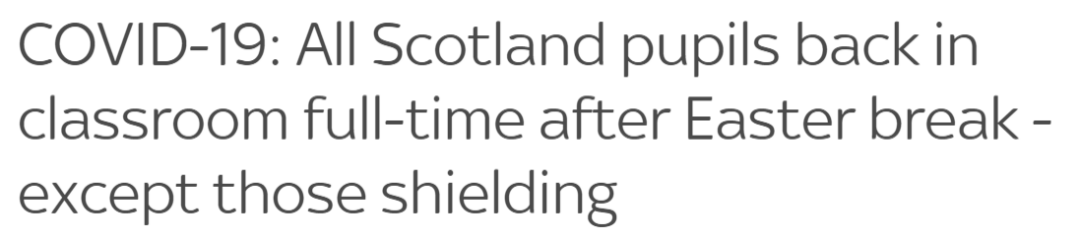 苏格兰首席大臣Nicola Sturgeon表示,苏格兰所有小学生都将在复活节假期后回到全日制教室,除了一些特殊被要求在家呆至4月26日的儿童。