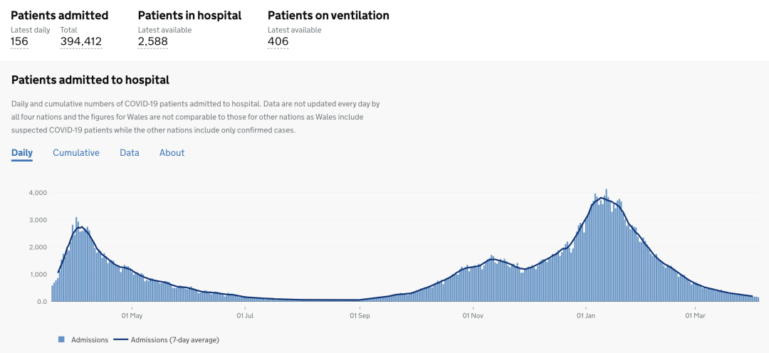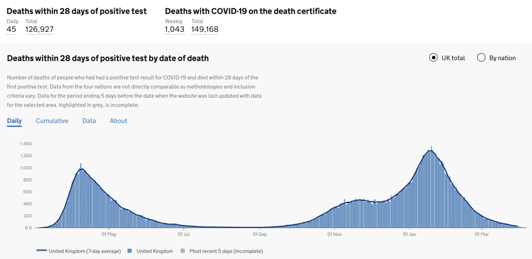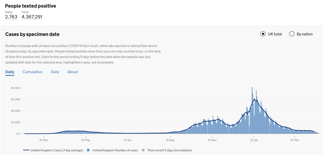 截止至2021年4月7日(周三)英国时间09:00,累计检测结果量128,712,320次(+631,846);累计确诊4,367,291例(+2,763);累计病亡126,927例(+45)。