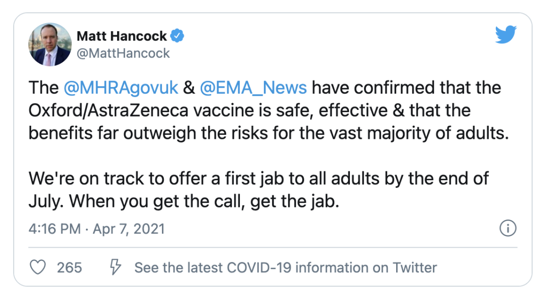 ● JCVI现在建议,那些年龄在18-29岁之间,没有潜在健康状况的人应该提供除牛津/阿斯利康疫苗之外的其他疫苗;
