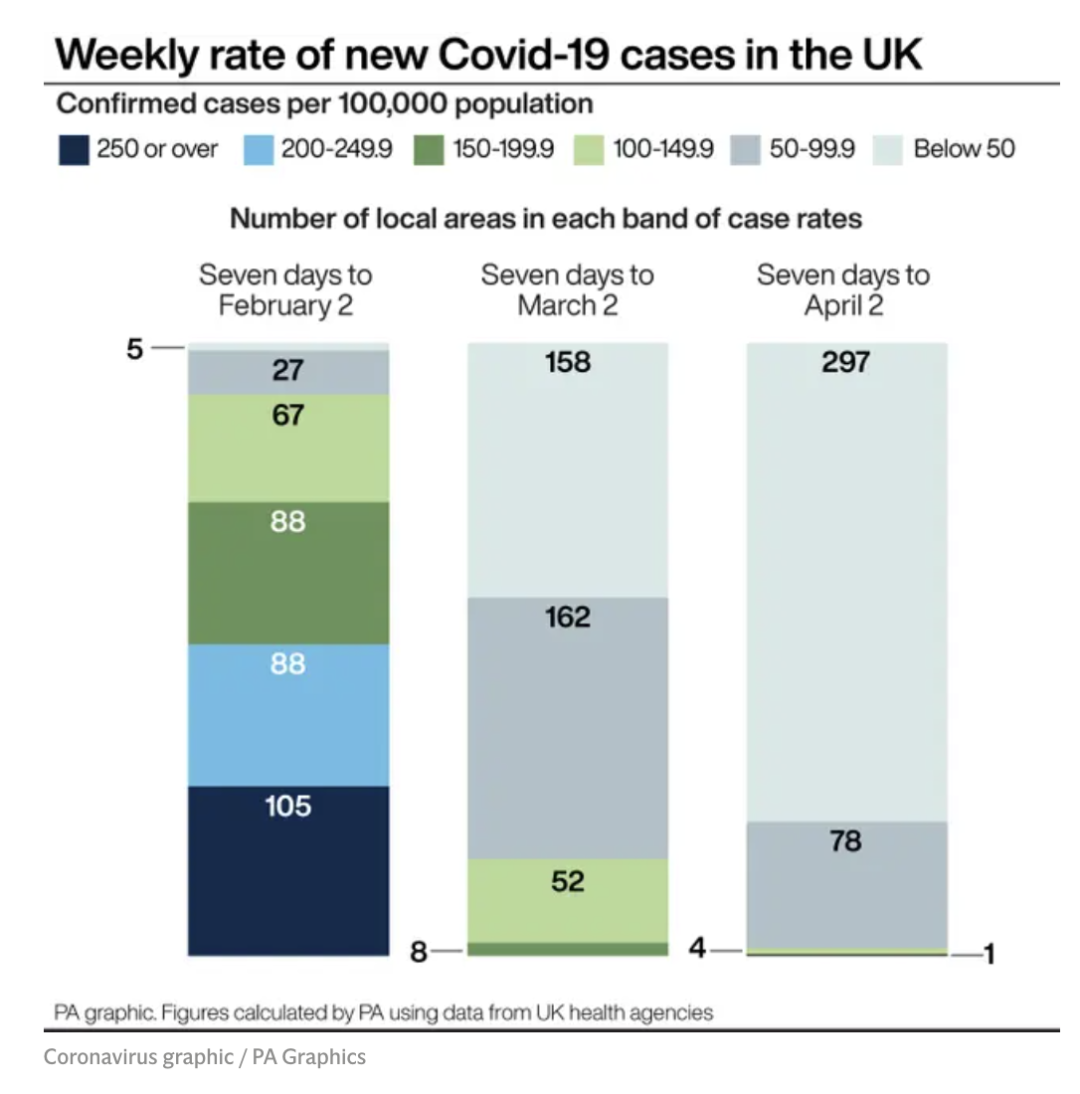 就最近数据来看,在截至4月2日的7天内,英国380个地方当局地区中,共有297个地区,约即78%的新冠病例率低于每10万人50例。