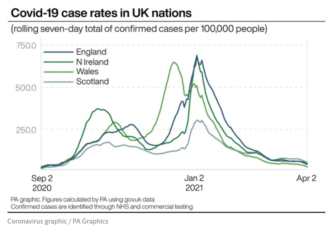 分地区显示:在英格兰,从Scarborough的49.7例/每10万人到德文郡Devon低到2.9例不等;威尔士的所有地区目前都低于每10万人50例,其中Bridgend创纪录最低——为8.2例。