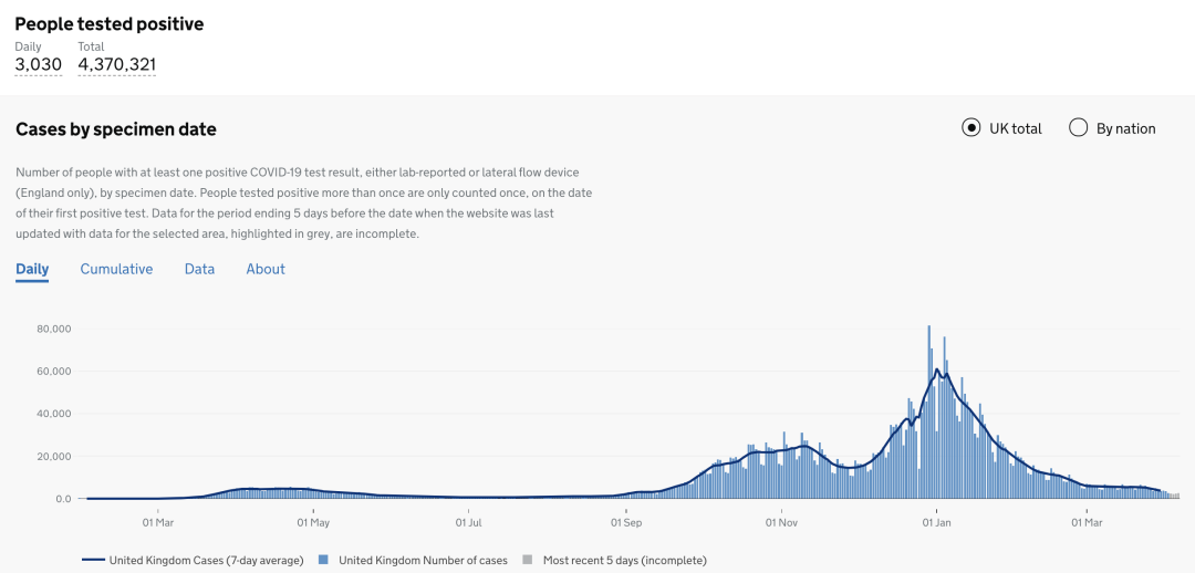 截止至2021年4月8日(周四)英国时间09:00,累计检测结果量129,798,698次(+1,034,088);累计确诊4,370,321例(+3,030);累计病亡126,980例(+53)。