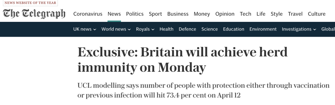 根据UCL本周公布的结果,通过接种疫苗或有新冠感染史而获得抗体保护的人数将在4月12日达到人口的73.4%——而该百分比足以使英国进入群体免疫状态。