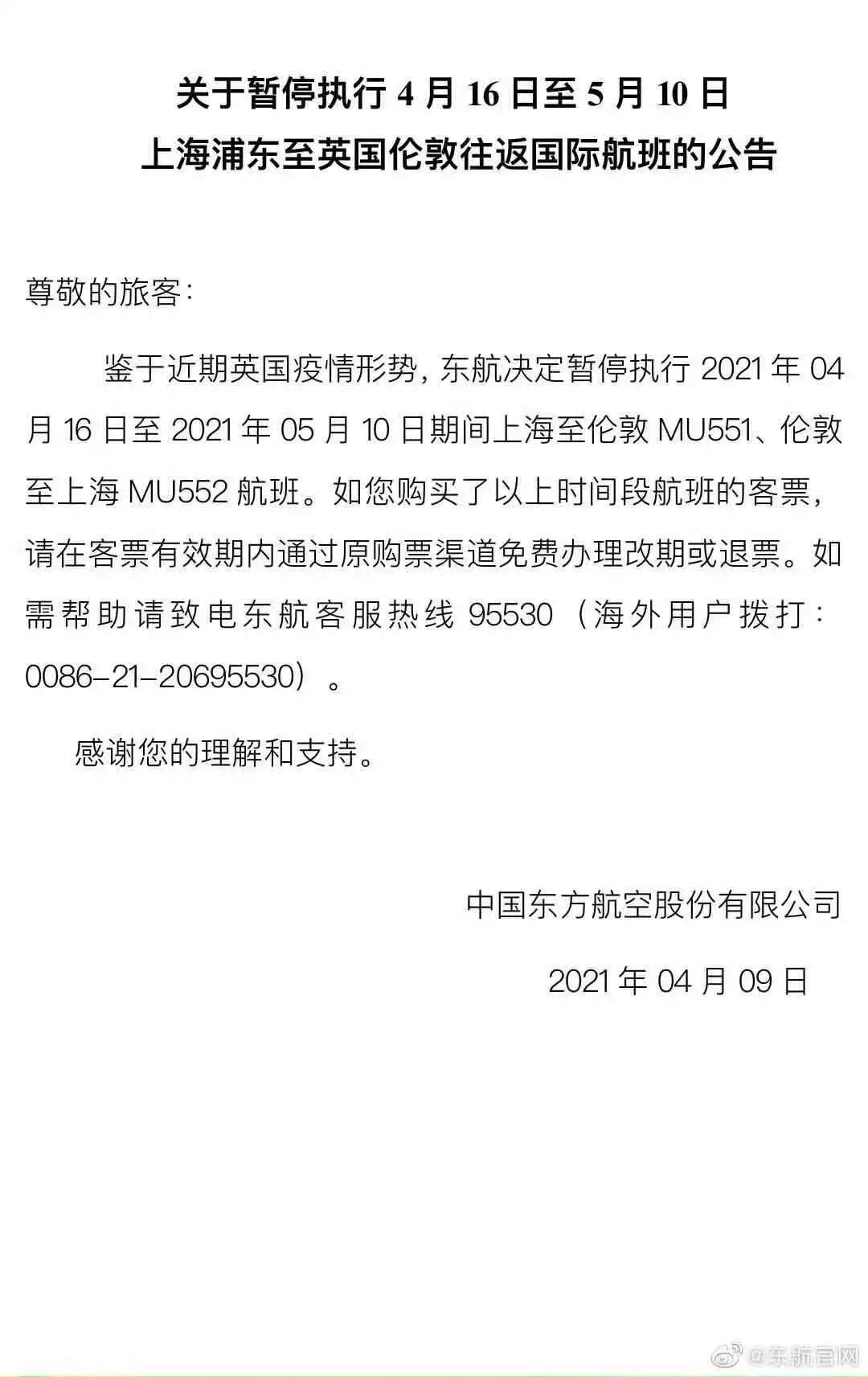 据东航官网消息,暂停执行4月16日至5月10日上海浦东至英国伦敦往返的国际航班。