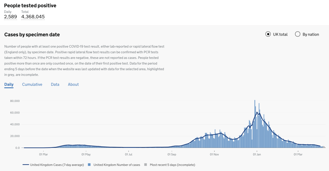截止至2021年4月10日(周六)英国时间09:00,累计检测结果量130,849,530次(待更新);累计确诊4,368,045例(+2,589);累计病亡127,080例(+40)。