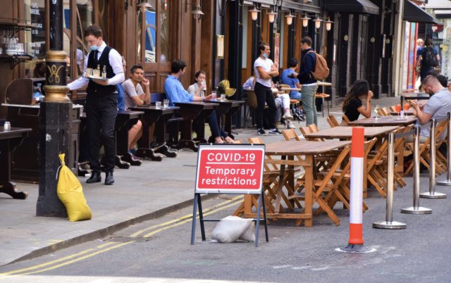 酒吧和餐馆只允许开放并为顾客提供户外服务。每一个来访顾客都要在NHS的Test and Trace应用程序上登记,团体人数限制在6人/两个家庭。