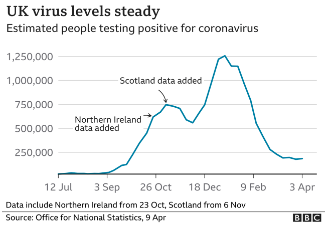 在截至4月3日的一周内,英格兰和北爱尔兰的感染率”可能仍保持水平",但苏格兰和威尔士的感染率有所下降。这意味着,只有不到0.3%的人口检测呈阳性。