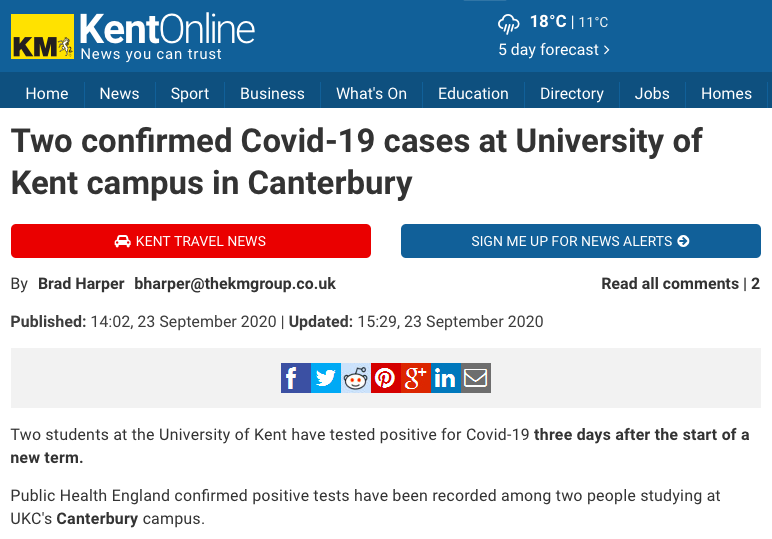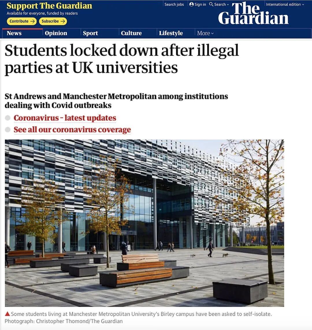 在曼彻斯特城市大学(MMU)的休姆伯利校区(Birley campus in Hulme)的公寓出现了确诊病例。该校发言人证实:“我校学生中有几例新冠肺炎确诊病例。”