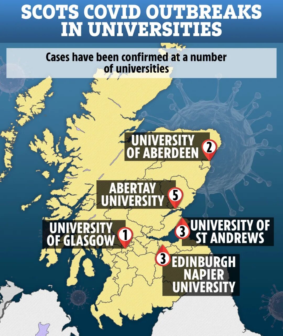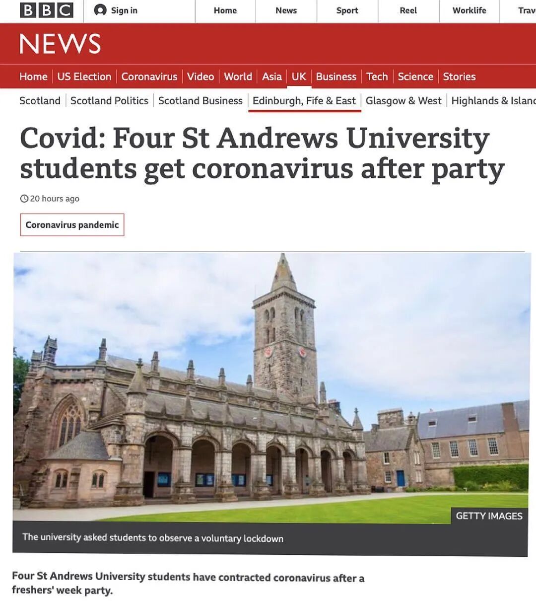 据悉,圣安德鲁斯大学的四名学生在新生周派对后确认感染。这也是继上周圣安德鲁斯发现3起病例之后的再次确诊,新病例使其确诊总数达到7起。