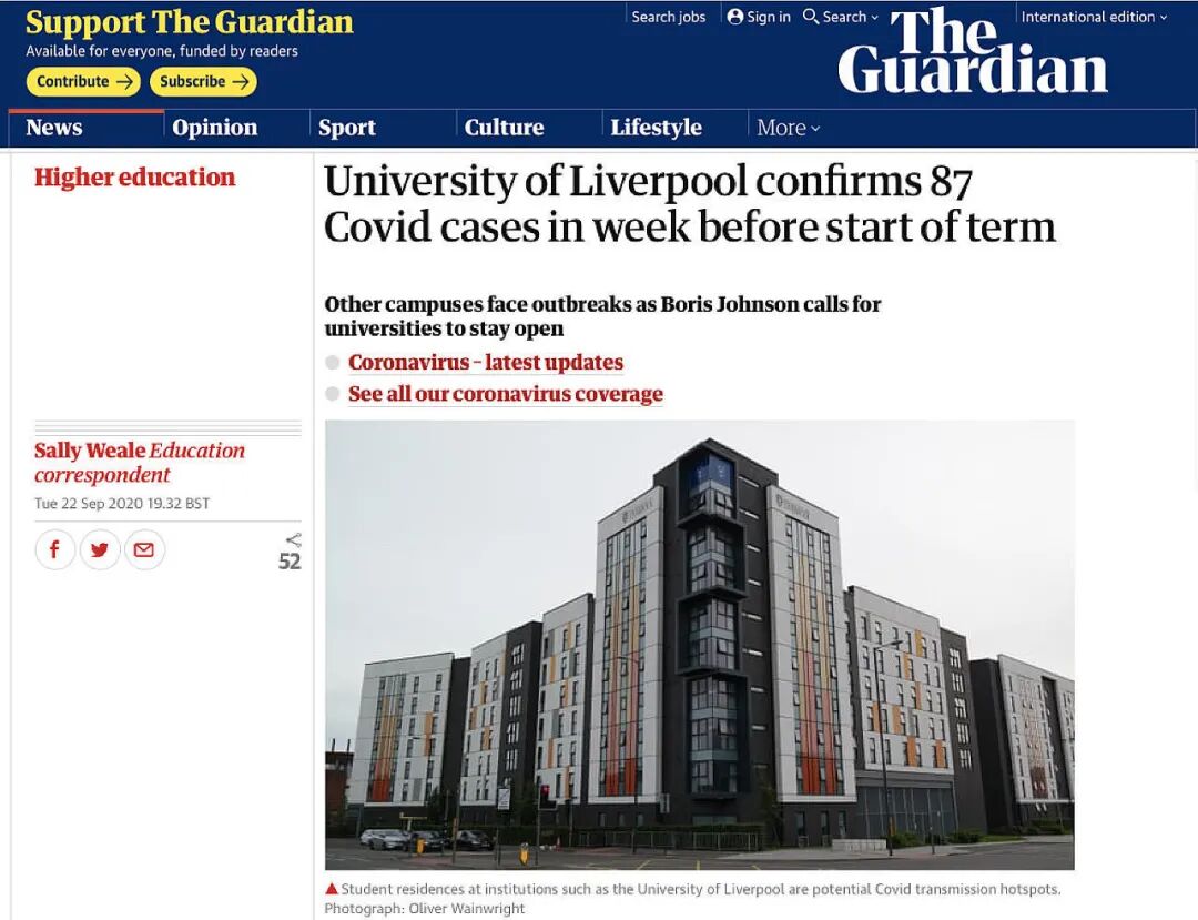 利物浦大学在正式开学前一周里已经出现了87例确诊病例,还没有具体声明这些确诊病例的具体原因。
