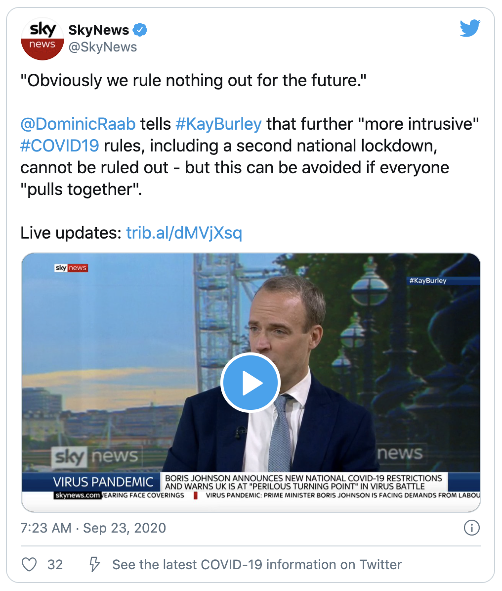 9月23日(周三),天空新闻对外交大臣Dominic Raab进行了采访,对于目前英国的疫情状况,Raab表示:不能排除第二次全面封锁的可能性。
