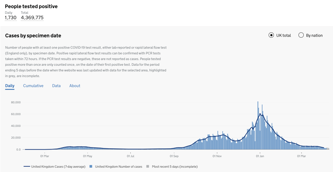 截止至2021年4月11日(周日)英国时间09:00,累计检测结果量130,849,530次(待更新);累计确诊4,369,775例(+1,730);累计病亡127,087例(+7)。