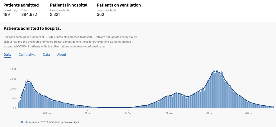 英国全境截至今日,已接种第1剂疫苗共32,190,576人(+69,223);已接种第2剂疫苗共7,656,205人(+189,665)。