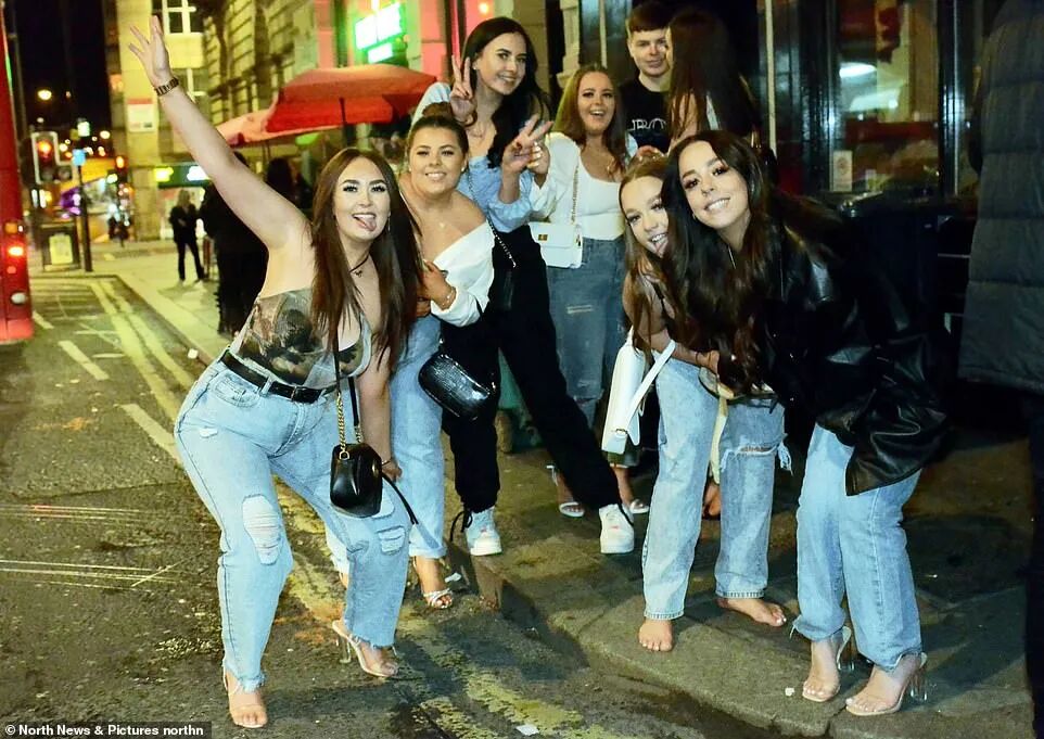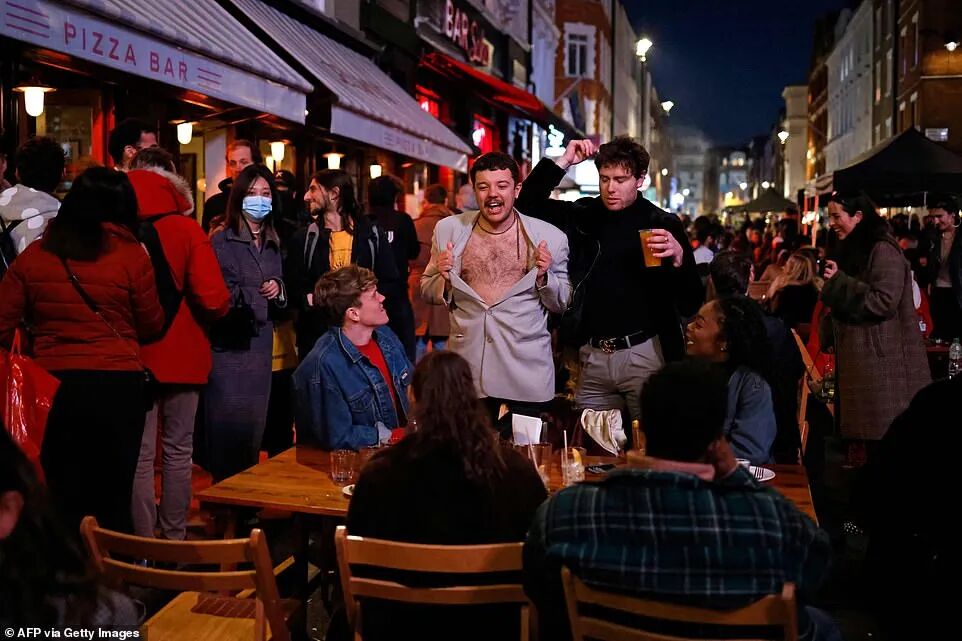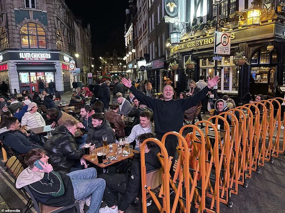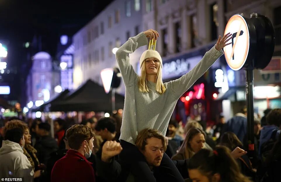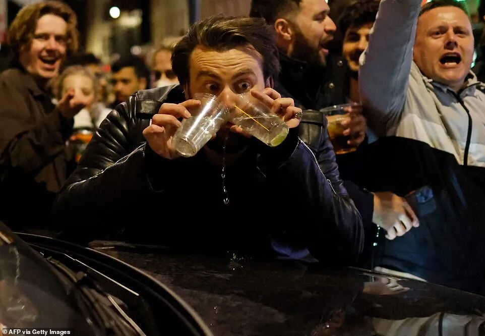 随后,英格兰各地的狂欢者们也提前享受了重归自由首日的夜晚——英国人涌回英国的酒吧和酒吧,喝下了四个月来的第一杯来自酒吧的,简直是开心得不得了。