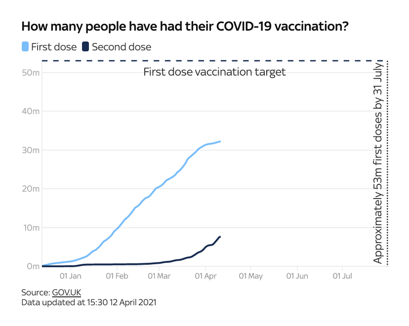 英国全境截至今日,已接种第1剂疫苗共32,250,481人(+59,905);已接种第2剂疫苗共7,857,396人(+201,191)。