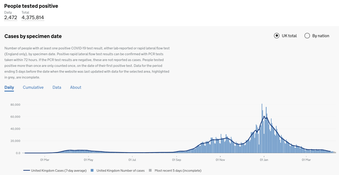 截止至2021年4月13日(周二)英国时间09:00,累计检测结果量134,397,573次(+874,399);累计确诊4,375,814例(+2,472);累计病亡127,123例(+23)。
